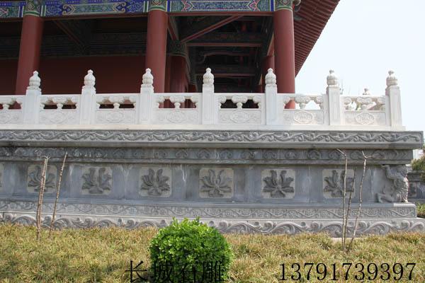 石欄桿,宋代稱“勾欄",多用于須彌座式臺(tái)基上,也有用于普通臺(tái)基上。石欄桿一般由望柱、欄板