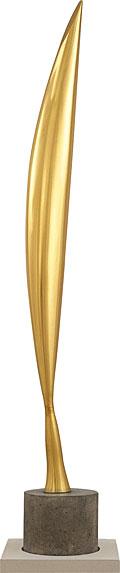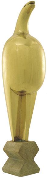 第二階段統(tǒng)稱“金色之鳥”時期,現(xiàn)存的作品僅有四件?!督鹕B》可以作為它們的代表。鳥身為青銅鑄成,高38英寸,底座為石和木作成,高48.5英寸。為了突出上升或飛翔的感覺,鳥身顯然拉長,頭和頸也進一步拉直,基本形成一條垂線,尾部為細(xì)長的圓椎形。下面的線盤已有顯著變化,成為多次重復(fù)的“之”字形,使人聯(lián)想到鳥翼和鳥翼在飛翔中的姿態(tài)。發(fā)亮的青銅在光照下形成一道道黑白光影,或表現(xiàn)為上沖的條條直線,或呈耀眼的亮點輕盈閃爍,更增加了上升的感覺。但這時的“鳥”還有大張的巨嘴,挺直的胸部,仍未完全離開它的基本原型。
