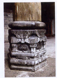 王家大院的柱礎(chǔ)石,在實用的基礎(chǔ)上,造型與裝飾*加豐富?,F(xiàn)存完整的柱礎(chǔ)石有鼓形、瓶形、瓜形、六面錘形等,上面雜雕著佛家八寶(法輪、法螺、白蓋、蓮花、盤長、寶瓶、寶傘、金魚)、民間八寶(寶珠、古錢、玉罄、犀元月、珊瑚、靈芝、銀錠、方勝)、道家八寶(漁鼓、玉笛、寶劍、葫蘆、花籃、紫板、芭蕉扇A-ti荷花),另外還有琴棋